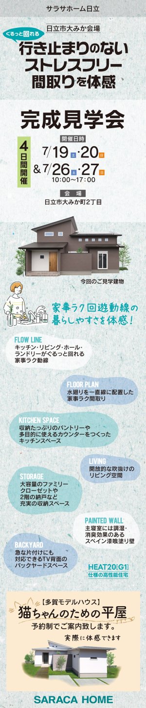 日立市大みかで、行き止まりのないストレスフリー間取りを体感できる住まいの完成見学会を開催致します。
