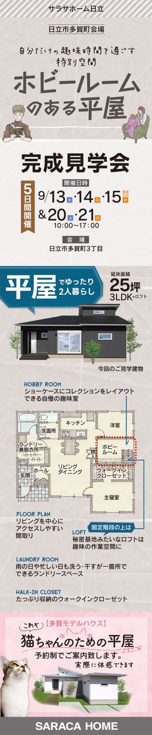 日立市多賀町3丁目で、自分だけの趣味時間を過ごせる、ホビールームのある平屋の完成見学会を開催致します。