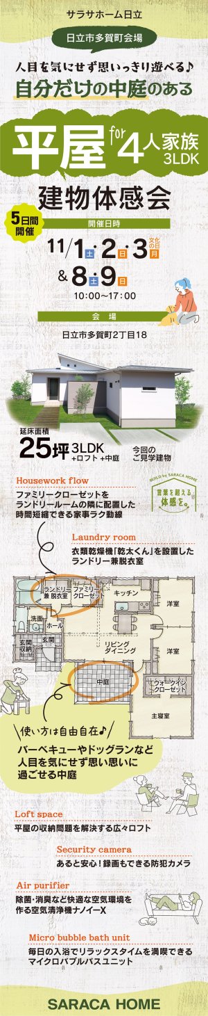 日立市多賀町2丁目で、人目を気にせず思いっきり遊べる♪自分だけの中庭のある平屋の建物体感会を開催致します。