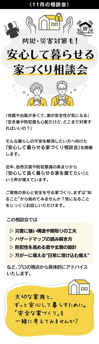 地震や台風などの自然災害、防犯面の不安を解消したい方へ。災害に強く、防犯性にも優れた“安心して暮らせる家づくり”のポイントを専門家がわかりやすく解説します。家族の安全を守る住まいづくり相談会、開催中です。