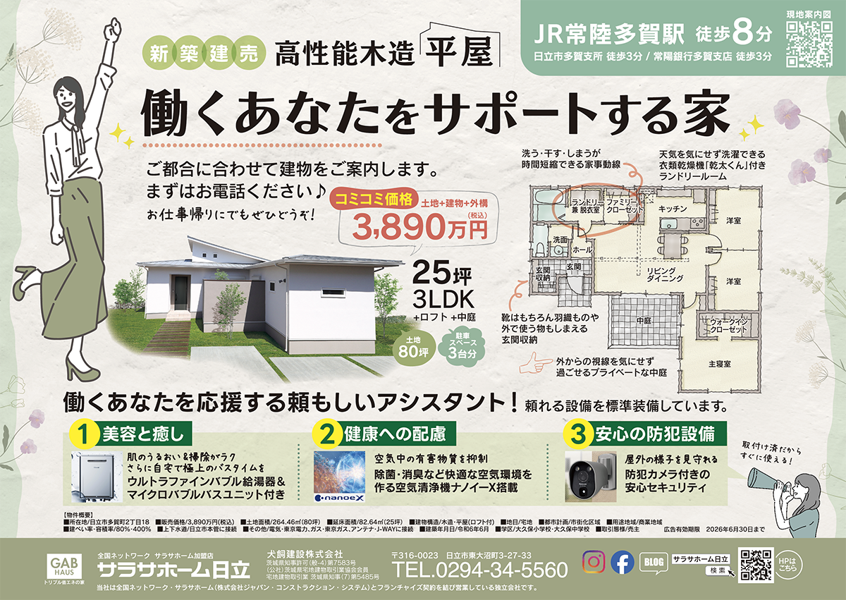 日立市諏訪町2丁目で、この家を建てたおかげで家事がグ〜ンと楽になった!手間を減らす「助かる〜」が満載の家の完成見学会を開催致します。平屋を見学希望の方は、多賀町の建物にスタッフが案内しますので、今回の見学会場(諏訪町)へ一度お越しください。